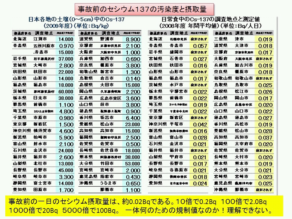 事故前の日本の一食当たりの汚染の目安が上の表にあります。私たちが目指すべきはこのレベルの安全ではないでしょうか?